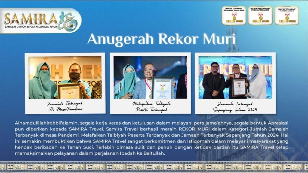 Samira Travel kembali menunjukkan kualitasnya sebagai penyelenggara ibadah yang unggul dan profesional. Dengan meraih Rekor MURI sebanyak 3 kali, Samira Travel mempertegas posisinya sebagai pihak terpercaya yang mengedepankan pelayanan terbaik bagi masyarakat Indonesia, khususnya bagi calon jamaah di Karawang. Prestasi ini semakin menguatkan reputasi kami sebagai travel umrah dan haji Karawang yang mampu memberikan pelayanan aman, nyaman, dan profesional.
